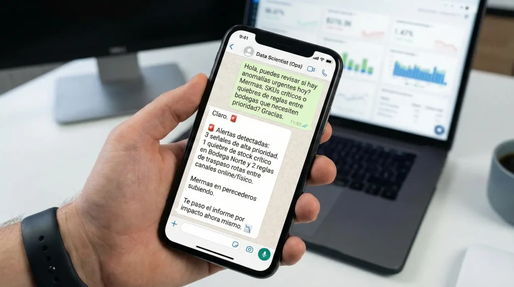 Detecta anomalías: mermas, SKUs críticos, quiebres, reglas rotas entre bodegas/canales.